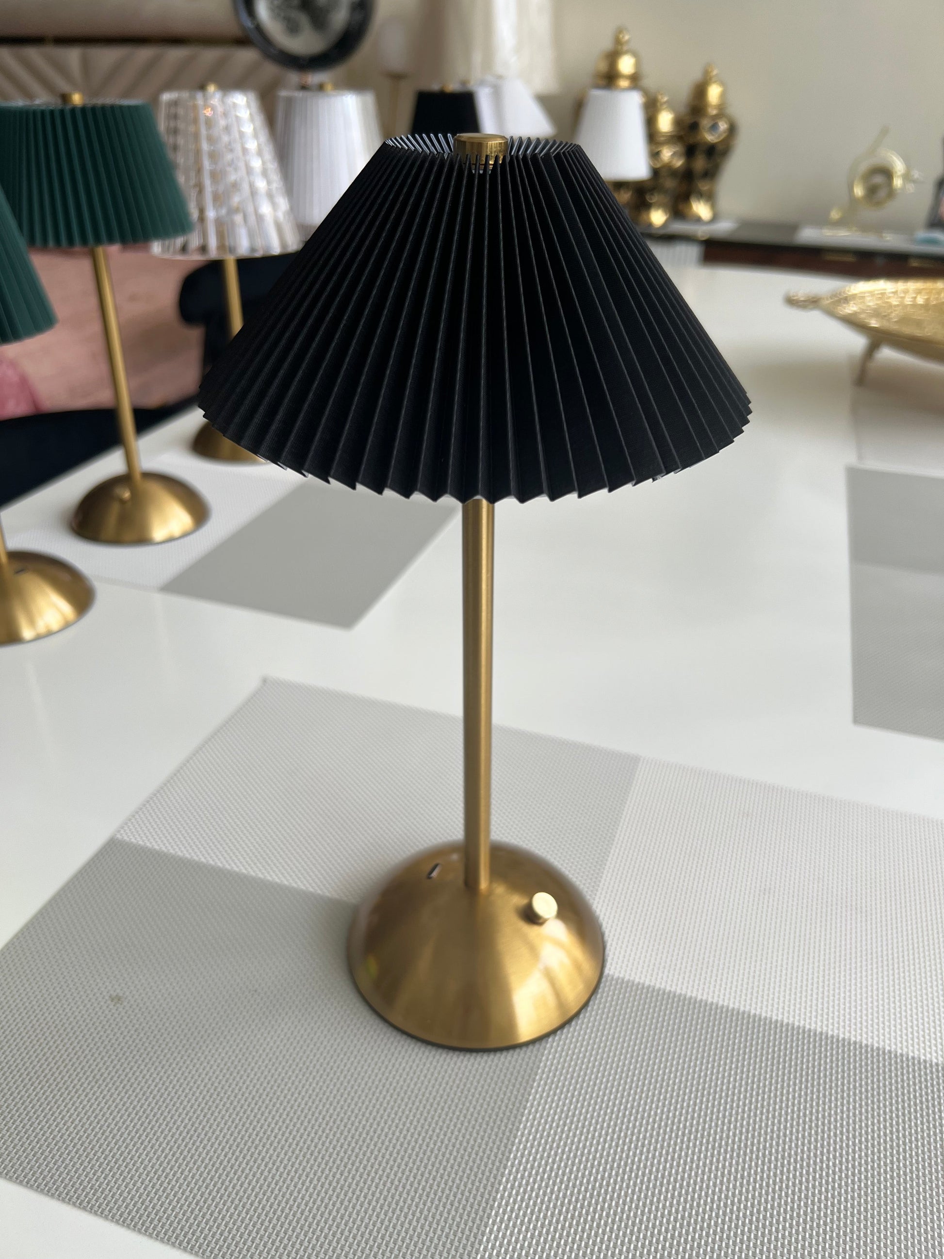 table lamp with a pleated, cream-colored shade and a brass-toned base and stem.