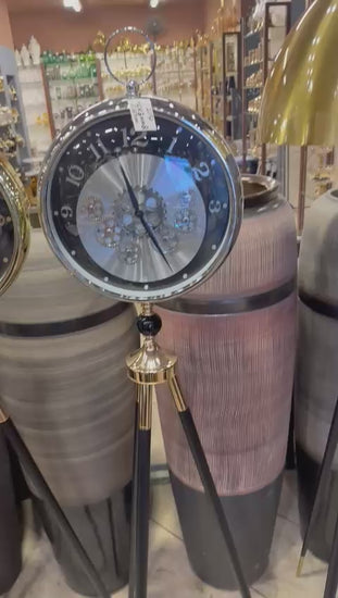 The prominent items are several large standing clocks with circular faces and tripod legs, available in various metallic finishes such as golden, silver, copper, blue, and green. These are described as imported standing clocks, some with skeleton designs.
